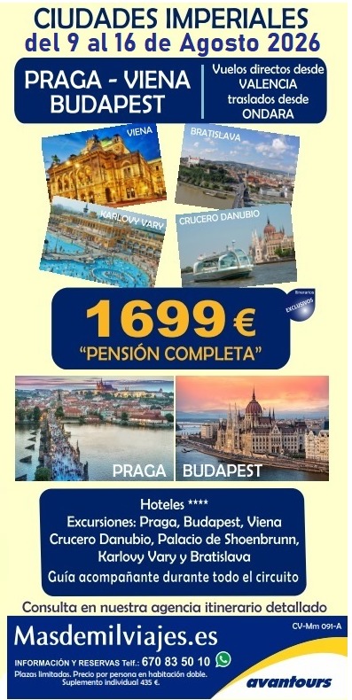 Cómo Reservar: Para reservar vuestro viaje a Praga, Viena y Budapest, simplemente ponte en contacto al tlf. 670835010 (llamada o mensaje de Whatsapp) o visita nuestra agencia en Ondara. Estaremos encantados de brindarte más detalles y responder a tus preguntas.¡Esperamos que te unas a nosotros en esta aventura!