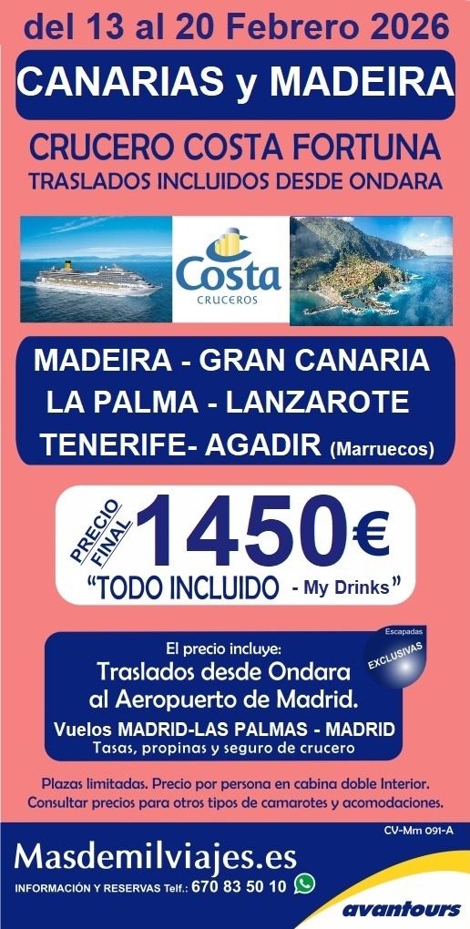 Cómo Reservar: Para reservar tu crucero y navegar por las Islas Canarias y Madeira, simplemente ponte en contacto al tlf. 670835010 (llamada o mensaje de whatsapp) o visita nuestra agencia en Ondara. Estaremos encantados de brindarte más detalles y responder a tus preguntas ¡Esperamos que te unas a nosotros en esta aventura!