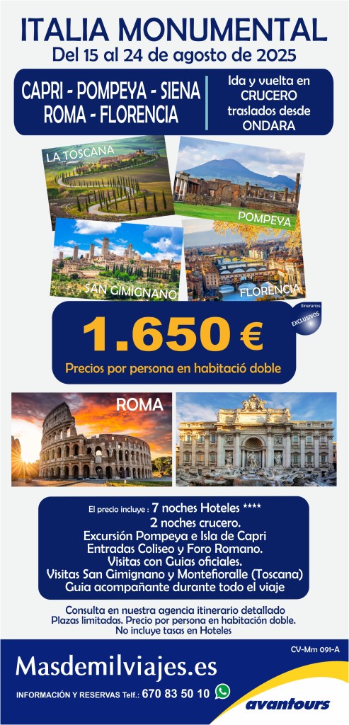 Cómo Reservar: Para reservar tu viaje a Italia simplemente ponte en contacto al tlf. 670835010 (llamada o mensaje de whatsapp) o visita nuestra agencia en Ondara. Estaremos encantados de brindarte más detalles y responder a tus preguntas ¡Esperamos que te unas a nosotros en esta aventura!