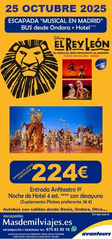 Cómo Reservar: Para reservar tu viaje al musical «El Rey León», simplemente ponte en contacto al tlf. 670835010 (llamada o mensaje de Whatsapp) o visita nuestra agencia en Ondara. Estaremos encantados de brindarte más detalles y responder a tus preguntas.¡Esperamos que te unas a nosotros en esta aventura!