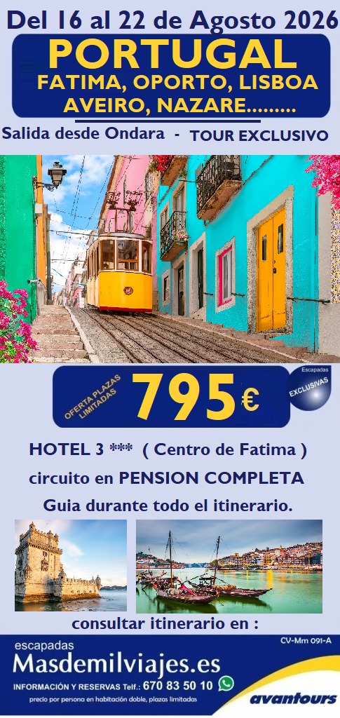 Destinos: Fátima, Oporto, Óbidos, Batalha, Lisboa, Nazaré, Alcobaça y Aveiro.