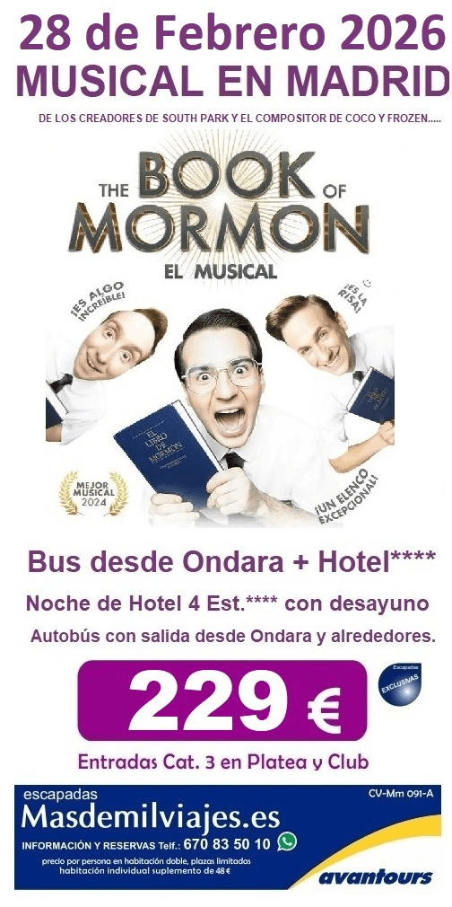 Cómo Reservar: Para reservar tu viaje al musical “The Book of Mormon», simplemente ponte en contacto al tlf. 670835010 (llamada o mensaje de Whatsapp) o visita nuestra agencia en Ondara. Estaremos encantados de brindarte más detalles y responder a tus preguntas.¡Esperamos que te unas a nosotros en esta aventura!