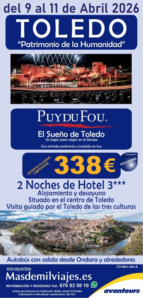 Visita a Puy du Fou: Durante nuestra estancia en Toledo, visitaremos Puy du Fou, un parque temático que ofrece espectáculos históricos y culturales únicos en España. También disfrutaremos del Sueño de Toledo, un espectáculo nocturno en el parque. «Un lugar para viajar en el tiempo.»